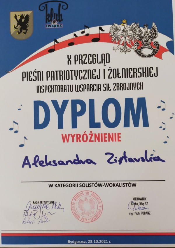 23 października odbył się w Bydgoszczy X Przegląd Pieśni Patriotycznej i Żołnierskiej. Nasza reprezentantka Aleksandra Ziętarska została doceniona przez Jury i zdobyła Wyróżnienie. Uczennicę przygotowała Anna Lis - nauczyciel muzyki w VI LO.