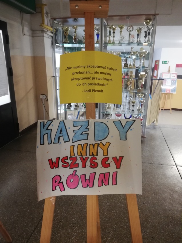 Uczniowie przygotowali plakaty, które zdobiły korytarz szkolny. Wszyscy mogli wylosować sobie hasło dotyczące obchodzonego święta, przygotowane przez pedagoga szkolnego. Wylosowane sentencje były głośno odczytywane przez młodzież i nauczycieli. Podczas dużej przerwy rozbrzmiewała muzyka, podkreślająca wagę tego przedsięwzięcia. Jako pierwsza wybrzmiała piosenka S. Sojki, pt.: ”Tolerancja”. Drzwi do sal lekcyjnych oklejone zostały kolorowymi kartkami, na których widniały hasła, mówiące o akceptacji, szacunku, uznaniu różnorodności kultur i odmienności. W obchody tego dnia włączył się także Samorząd Uczniowski, który zachęcił młodzież do ubioru w kolorze zielonym, na znak tolerancji.