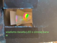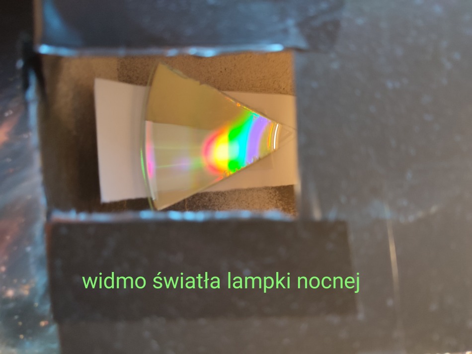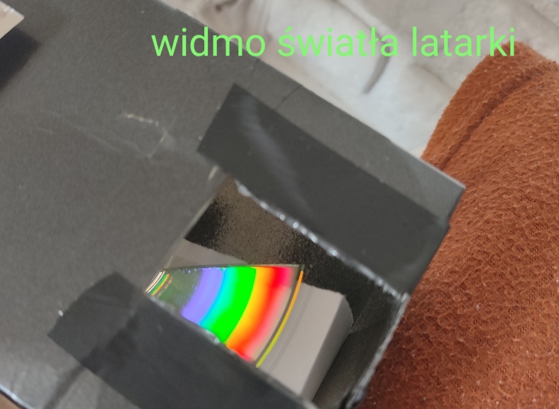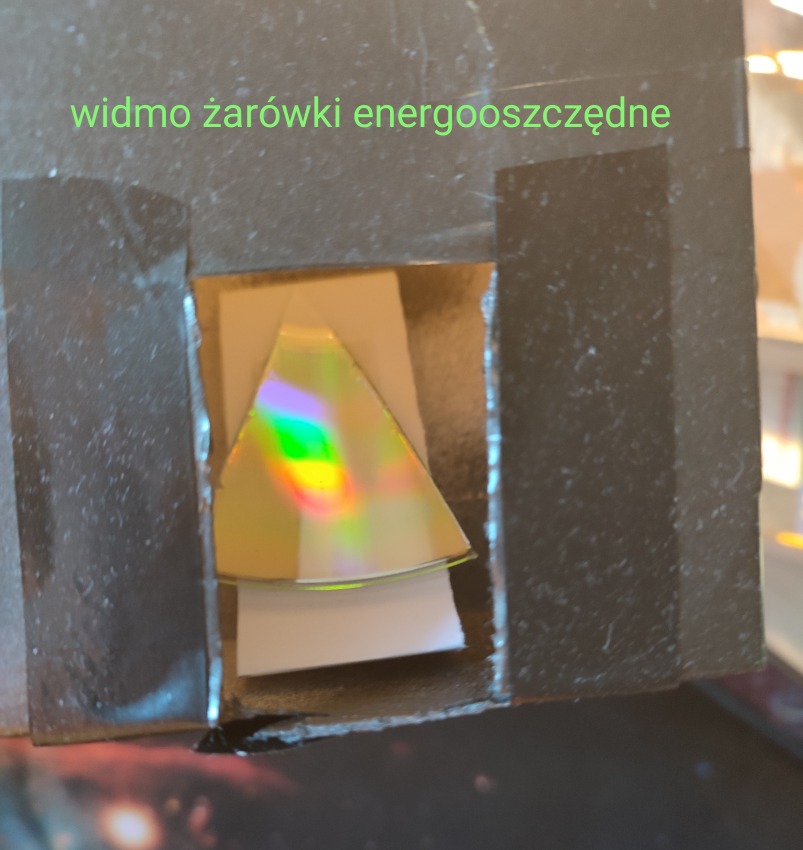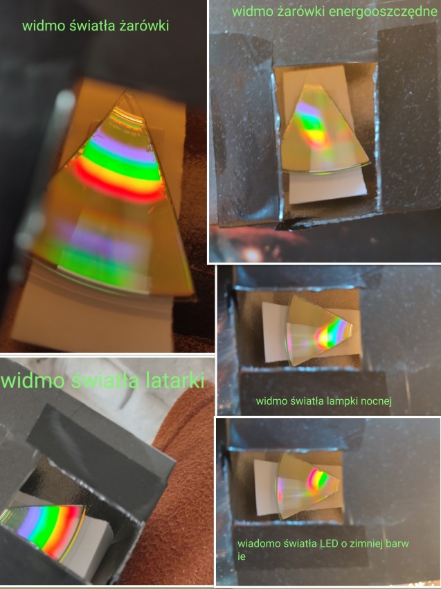 Uczniowie klas 3 w ramach dodatkowego zadania domowego budowali spektroskop z kartonu, fragmentu płyty CD oraz folii aluminiowej. Za pomocą skonstruowanego przez