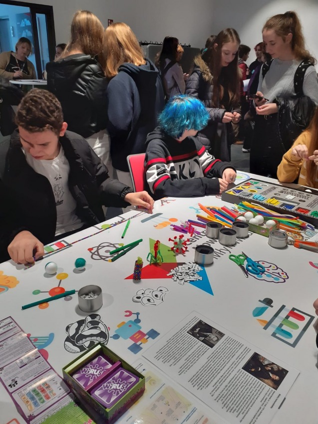 Uczniowie klasy IE oraz IIIB wraz z p. Agatą Białuchą i p. Anną Czerniak w ramach lekcji biologii i fizyki, 9 listopada odwiedzili Młyn Wiedzy, biorąc udział w akcji „SPINDay 2022”. Korzystając z przygotowanych stanowisk mogli poszerzyć swoją wiedzę na temat szczepionek, wirusów oraz zbudować model wirusa. Wykonując mydełka mogli dowiedzieć się o środkach dezynfekcji oraz obejrzeć swoja skórę pod mikroskopem. Poprzez różne zabawy i doświadczenia mogli zapoznać się z działaniem żyroskopu oraz sprawdzić jak działa pierwowzór aparatu fotograficznego – camera obscura. Organizatorzy przygotowali również zagadki związane z mózgiem. Miłośnicy zwierząt mogli porozmawiać z behawiorystą i trenerem psów oraz wykonać zabawkę dla swojego zwierzaka.