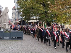 godzina 12 – przemarsz ulicami starówki pod pomnik marszałka Józefa Piłsudskiego na placu Rapackiego, w jego trakcie - powitanie piernikami marszałka Józefa Piłsudskiego na Rynku Staromiejskim (inscenizacja), odśpiewanie hymnu w ramach akcji „Niepodległa do Hymnu” przy Dworze Artusa;