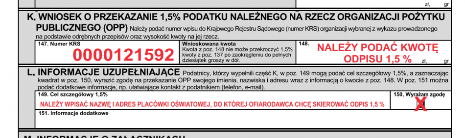 W związku z trwającym okresem rozliczeń podatkowych, zachęcamy do przekazania 1,5% na rzecz naszej szkoły.