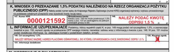 Zachęcamy do przekazania 1,5% na rzecz naszej szkoły w rozliczeniu podatkowym.