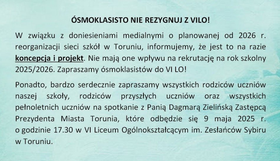 pełnoletnich uczniów na spotkanie z Panią Wiceprezydent Miasta Torunia, które to spotkanie odbędzie się 9 maja 2025 r. o godzinie 17.30 w naszej szkole.