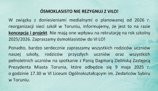 W związku z doniesieniami medialnymi o planowanej od 2026 r. reorganizacji sieci szkół w Toruniu, informujemy, że są to na razie założenia i projekty. Nie mają one żadnego związku z rekrutacją na rok szkolny 2025/2026.