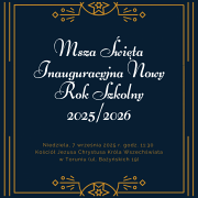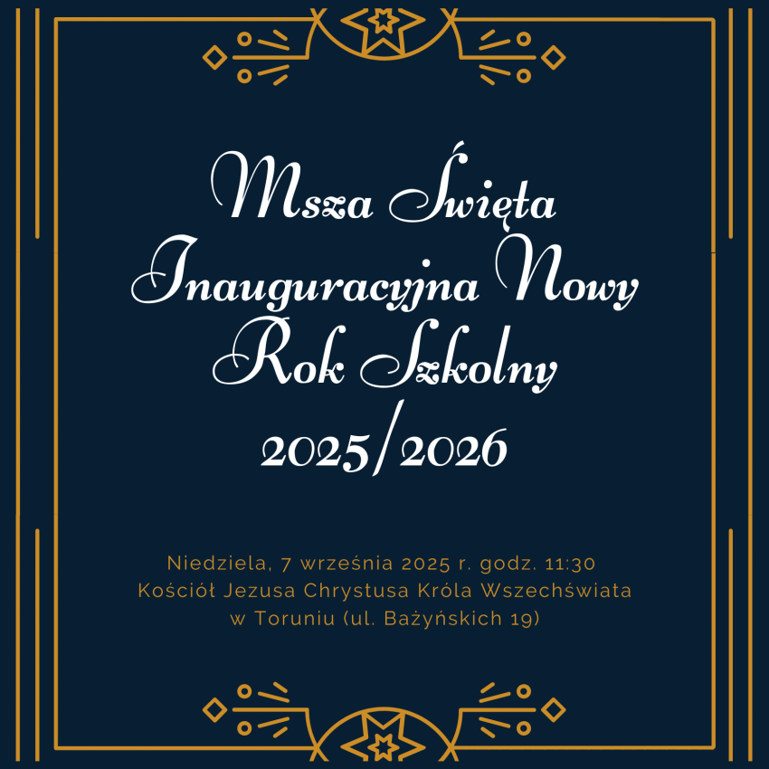 Drodzy Uczniowie, Szanowni Nauczyciele i Wychowawcy, jako nowy katecheta w naszej szkole serdecznie zapraszam Was na Mszę Świętą inaugurującą rok szkolny 2025/2026, która odbędzie się w niedzielę 7 września 2025 o godz. 11:30 w kościele Jezusa Chrystusa Króla Wszechświata w Toruniu (ul. Bażyńskich 19). Podczas wspólnej modlitwy będziemy prosić o dary Ducha Świętego, siłę i światło dla uczniów, nauczycieli oraz całej społeczności szkolnej, aby nowy rok przyniósł wiele dobrych owoców.