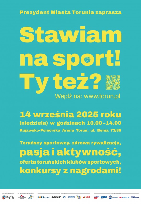W niedzielę, 14 września 2025 r., w Narodowy Dzień Sportu zapraszamy wszystkich mieszkańców do Kujawsko-Pomorskiej Areny Toruń na drugą edycję wyjątkowego wydarzenia „Stawiam na Sport! Ty też?”. To niepowtarzalna okazja, aby w jednym miejscu poznać bogatą ofertę szkoleniową toruńskich klubów sportowych na rok szkolny/sezon 2025/2026. Swoje propozycje zaprezentuje ponad 40 klubów sportowych. Ponad 20 dyscyplin sportowych – od gier zespołowych: piłki nożnej, siatkówki,