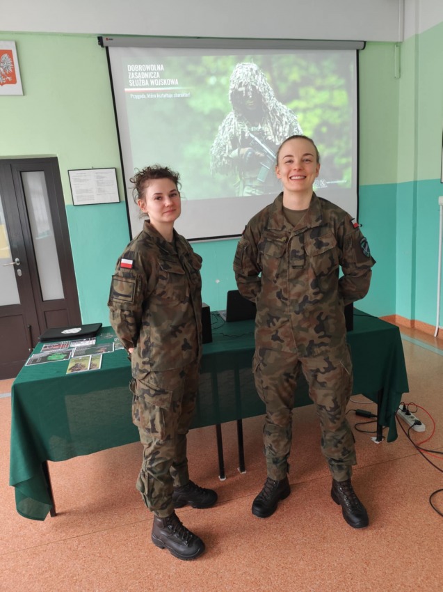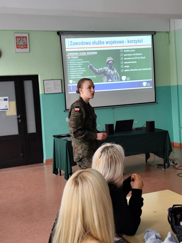 W naszej szkole odbyło się w piątek 20.03. w ramach doradztwa zawodowego spotkanie z przedstawicielkami Wojskowego Centrum Rekrutacji, które przybliżyły uczniom temat zawodów mundurowych. Podczas wizyty żołnierki opowiedziały o możliwościach rozwoju kariery w wojsku, ścieżkach edukacyjnych oraz wymaganiach stawianych kandydatom. Uczniowie mieli okazję dowiedzieć się, jakie są realne zarobki w służbie, jak wygląda codzienność żołnierza oraz jakie specjalizacje można wybrać – zarówno dla kobiet, jak i mężczyzn.
